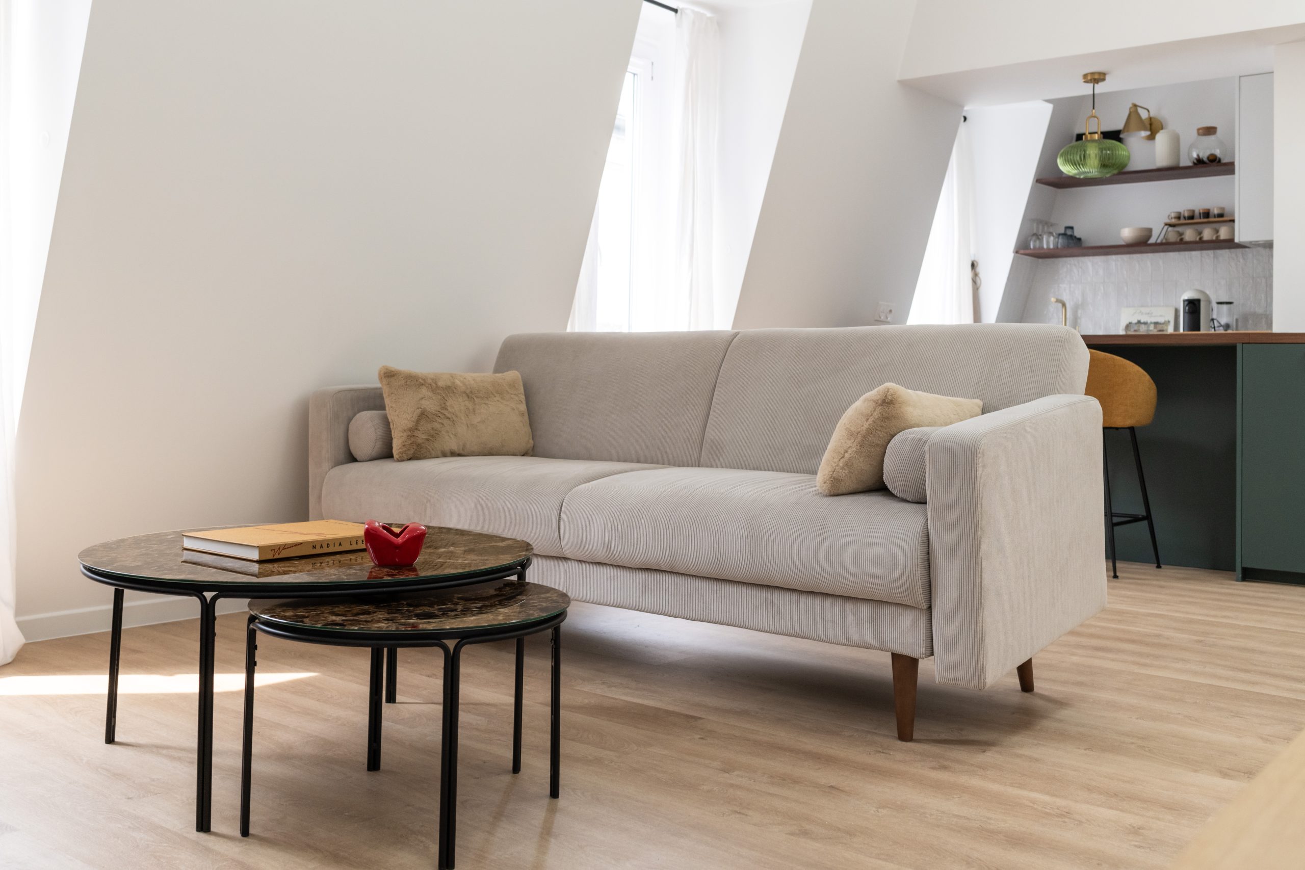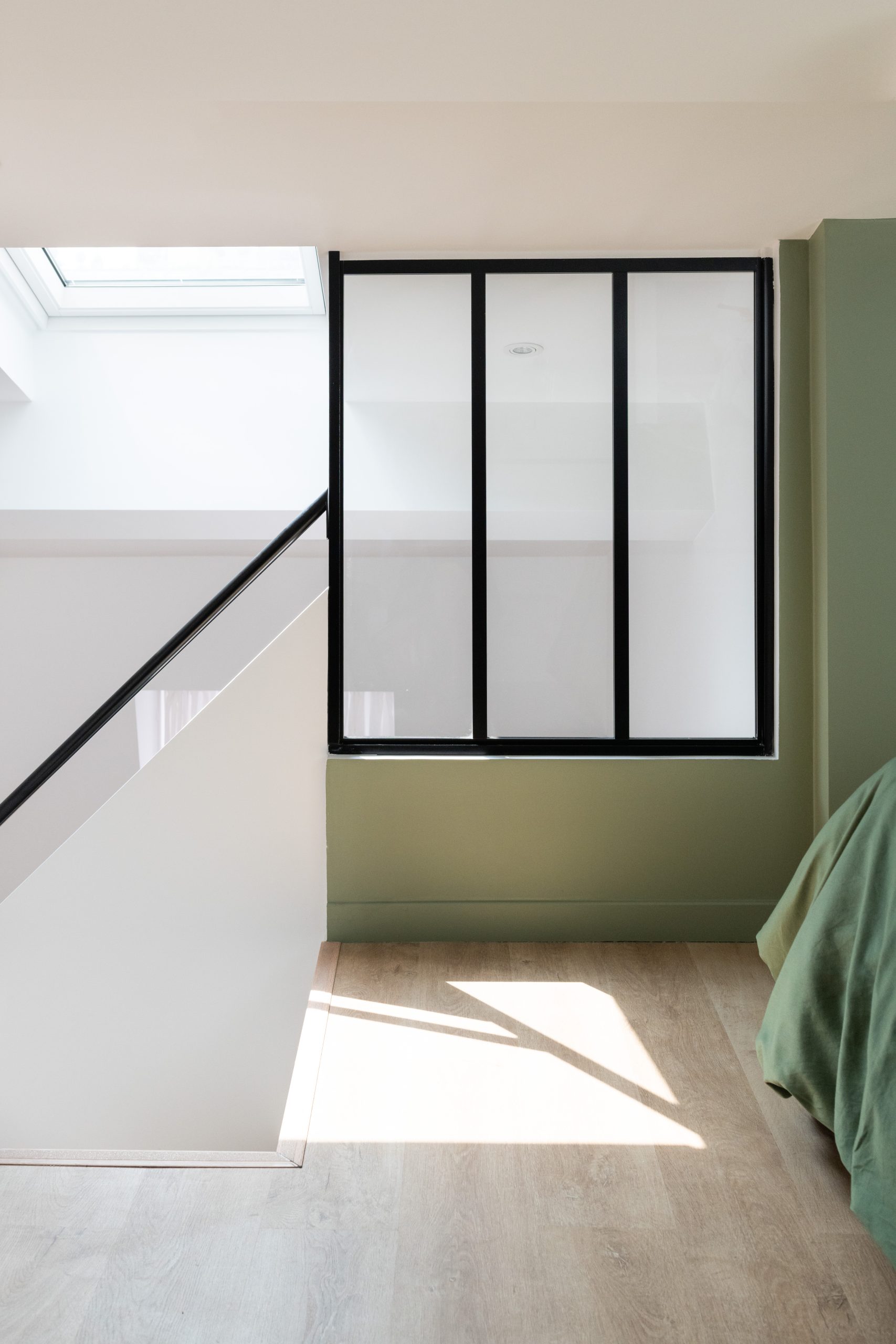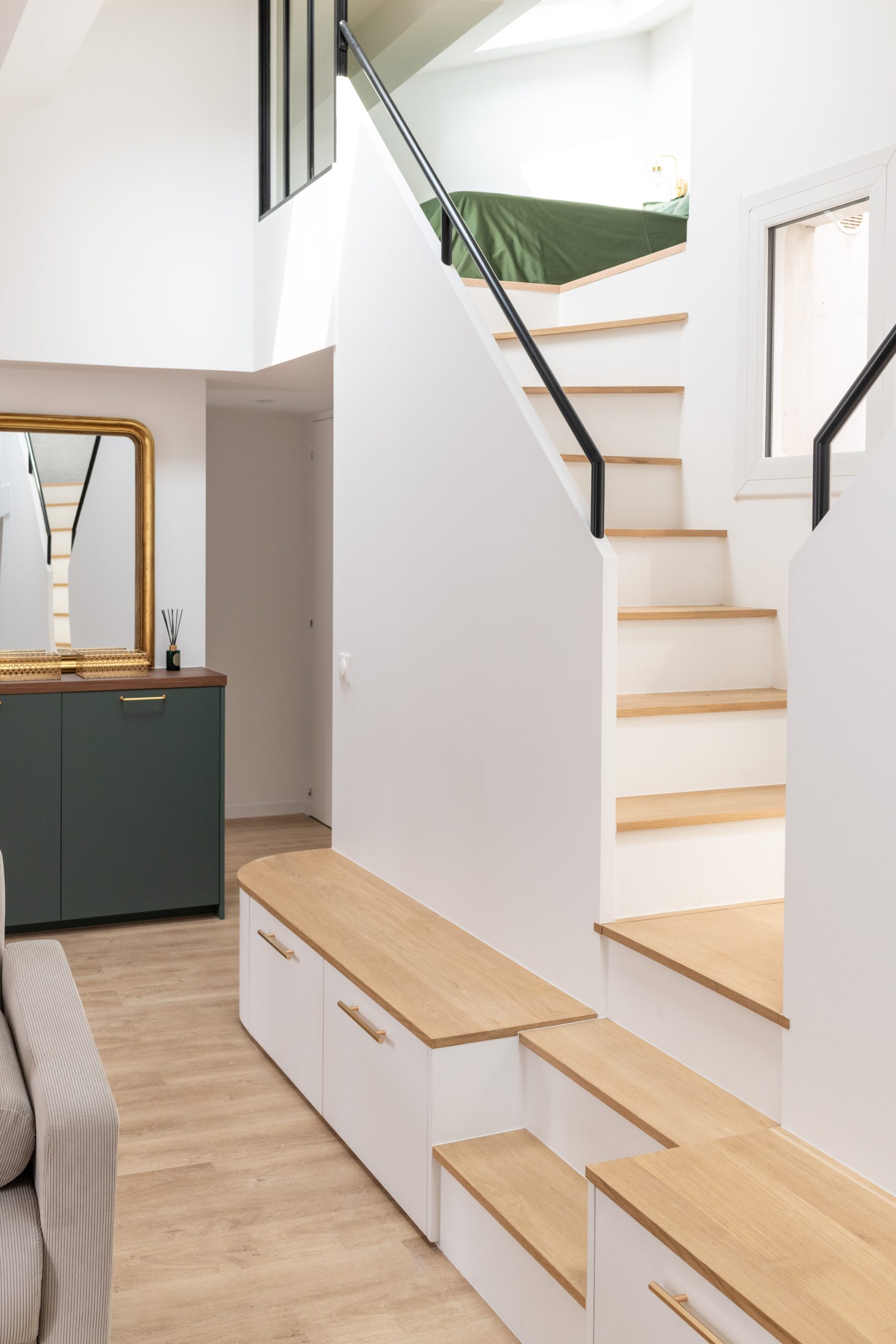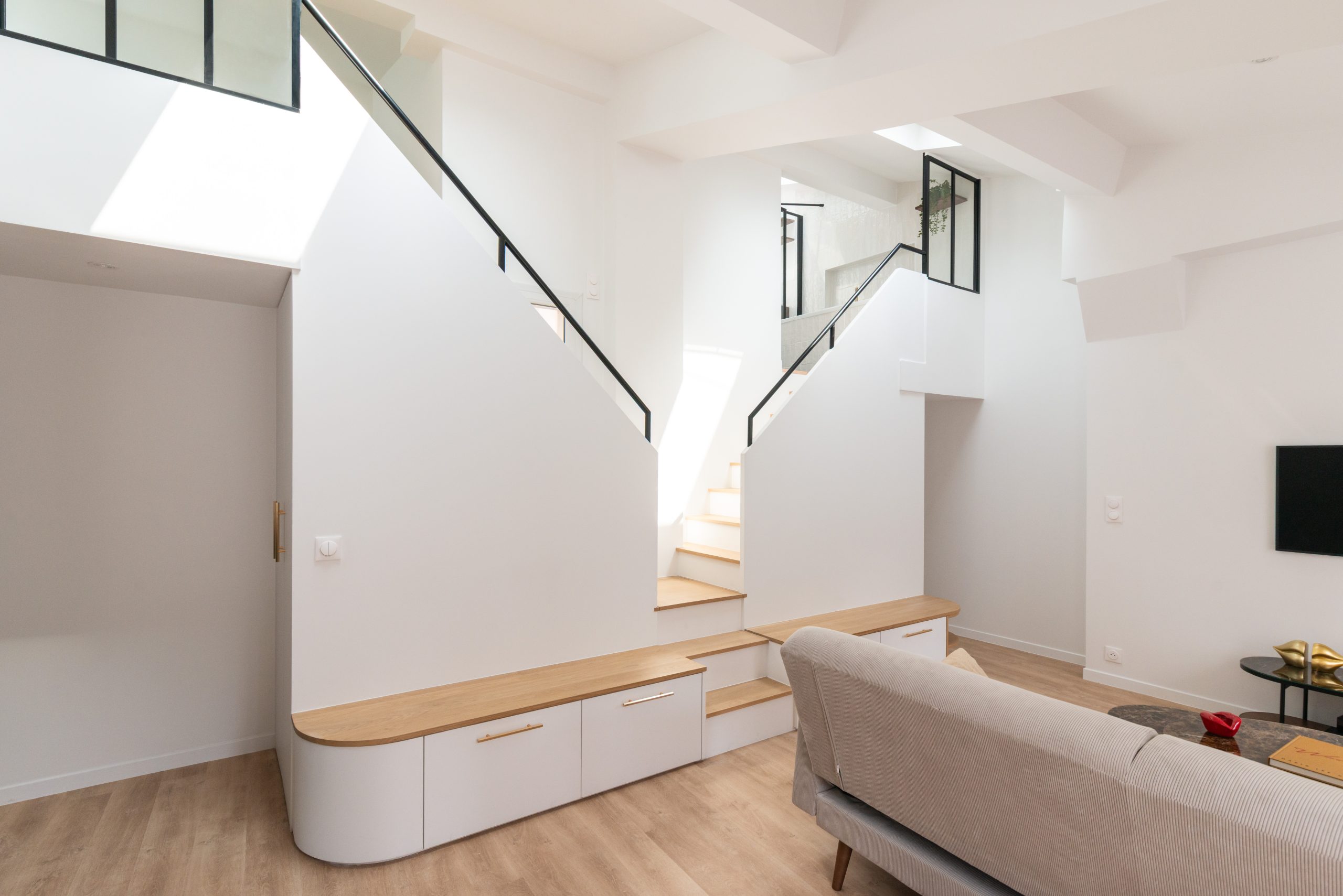 Cet appartement se trouve au cœur du 17ème arrondissement de Paris. Il possédait déjà beaucoup de charme, mais aussi de vraies contraintes. Pour libérer tout son potentiel, nous avons choisi de repartir presque de zéro : le plancher du haut a été intégralement démoli ! ans ce projet, la lumière a joué un rôle central. Nous avons créé 4 vélux pour baigner les pièces de soleil tout au long de la journée. Deux mezzanines viennent désormais optimiser l’espace et offrir de nouvelles perspectives à cet appartement. Et pour relier le tout, nous avons dessiné un escalier sur-mesure. La circulation entre les espaces a été totalement repensée : certaines cheminées ont été supprimées pour ouvrir le dialogue entre le salon et la cuisine. Résultat ? Un lieu transformé, lumineux et fonctionnel, qui ne ressemble plus du tout à ce qu’il était au départ !