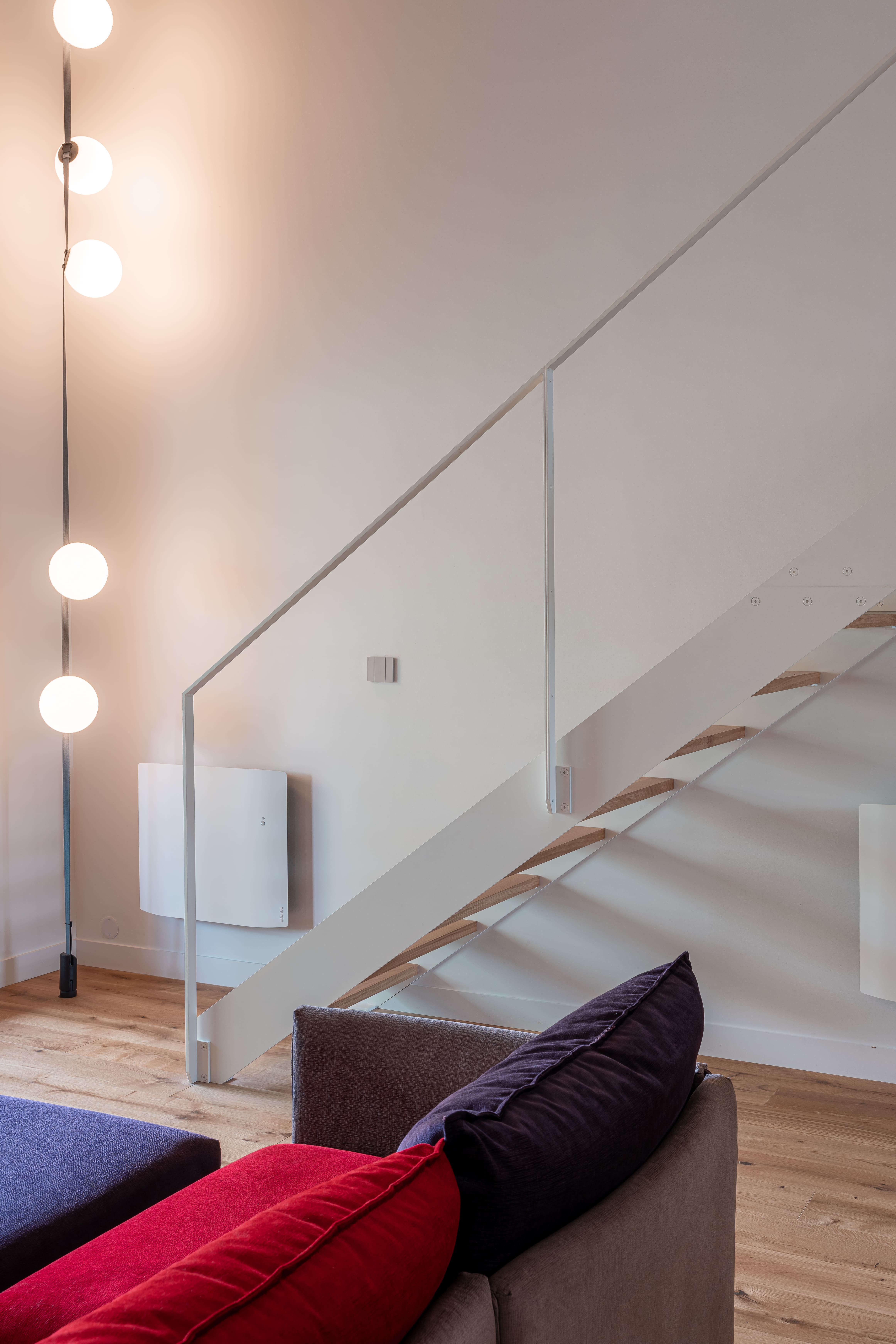 Pour la rénovation de ce bien, c’est l’architecte partenaire Luc Voisin qui a réfléchis au nouvel aménagement. Nous avons conservé tous les volumes existants en l’état mais les sols, les radiateurs, la cuisine, la salle de bain et quelques ouvertures ont été déposés pour être remplacés. Au rez-de-chaussée, nous avons rénové entièrement la cuisine et les salles de bains avec des choix de beaux matériaux. Un travail important de menuiserie sur mesure a été réalisé pour créer une magnifique bibliothèque sur deux étages, allant jusqu’au plafond, pour habiller le mur du séjour. Un escalier a aussi été dessiné ainsi que les gardes corps pour conserver la continuité avec la rampe d’escalier. À l’étage, nous avons créé une suite parentale avec l’ajout d’une salle de bain. Elle repose sur une estrade afin d’être surélevée et délimitée du couloir de la mezzanine, séparée par une verrière qui permet de profiter d’une belle lumière dans cette pièce. La suite parentale se trouvant sous des rampants, tous les rangements ont également été réalisés sur mesure, tout comme l’espace bureau. Enfin un beau travail de lumière a été réalisé en choisissant des équipements particuliers pour harmoniser ce loft et avoir une lumière indirecte diffuse sur certains points stratégiques. Pour améliorer la consommation énergétique de cet appartement, les propriétaires ont faire le choix de mettre des radiateurs basse consommation.