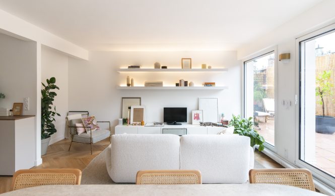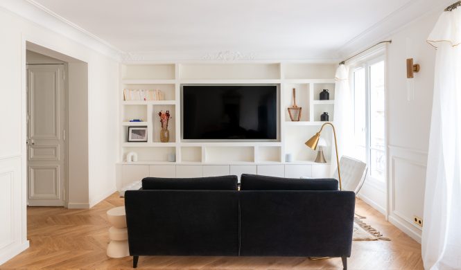Nous avons remis l’ensemble des lieux au gout du jour. Nos équipes ont refait une partie de l’électricité, changé les sols pour un parquet en point de Hongrie et repeint tout l’appartement.
