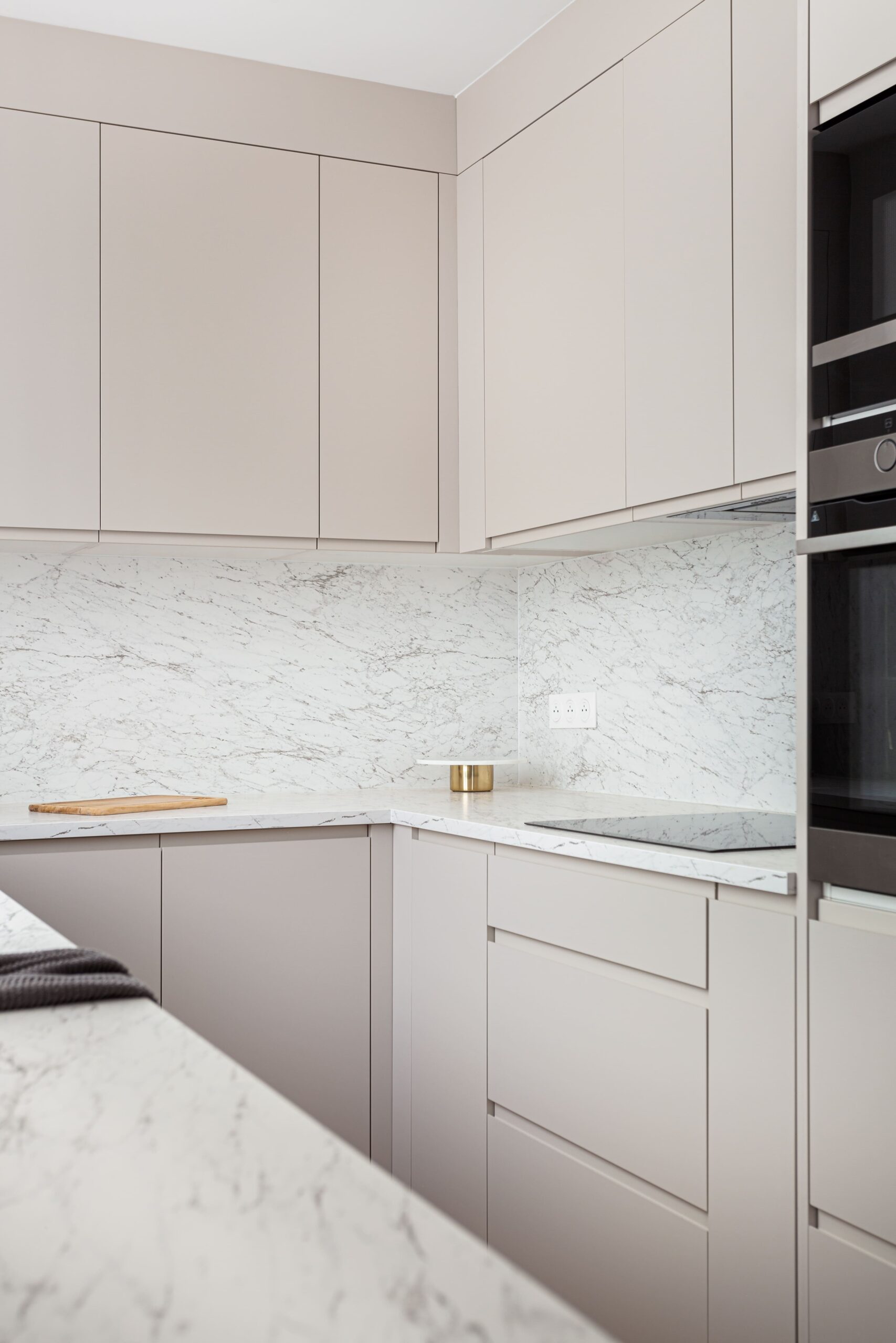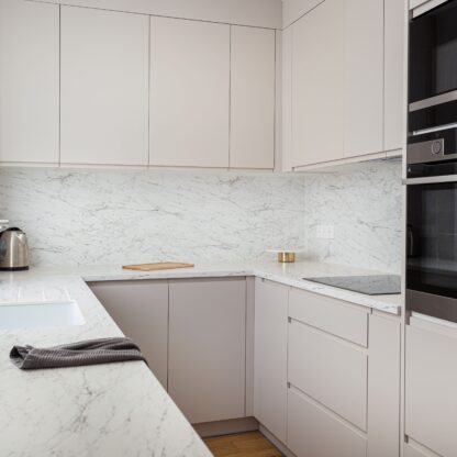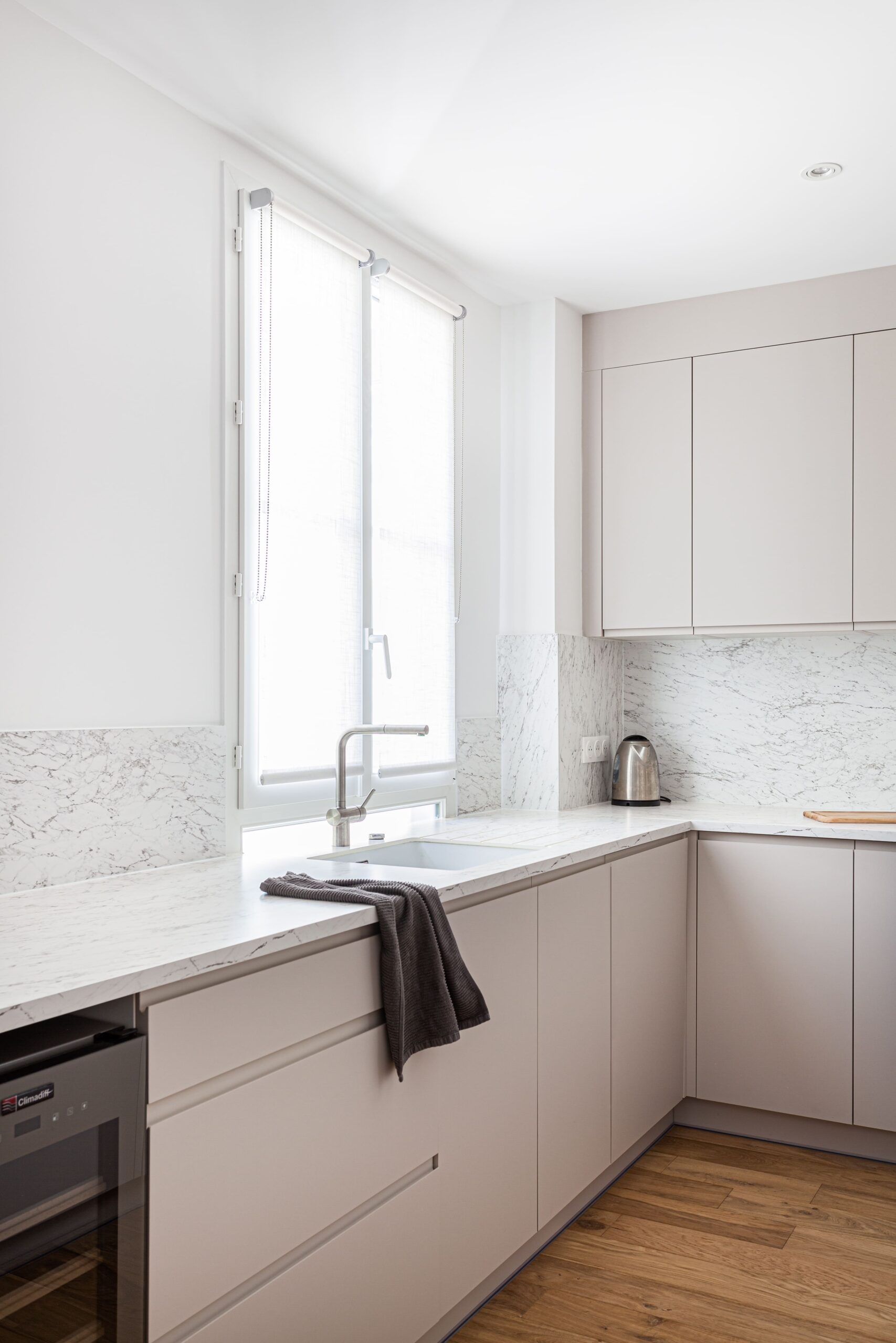 La belle cuisine, c’est une Little Worker biensûr ! Il s’agit de la gamme Opale avec ses façades couleur amande et un plan de travail compact marbré blanc.