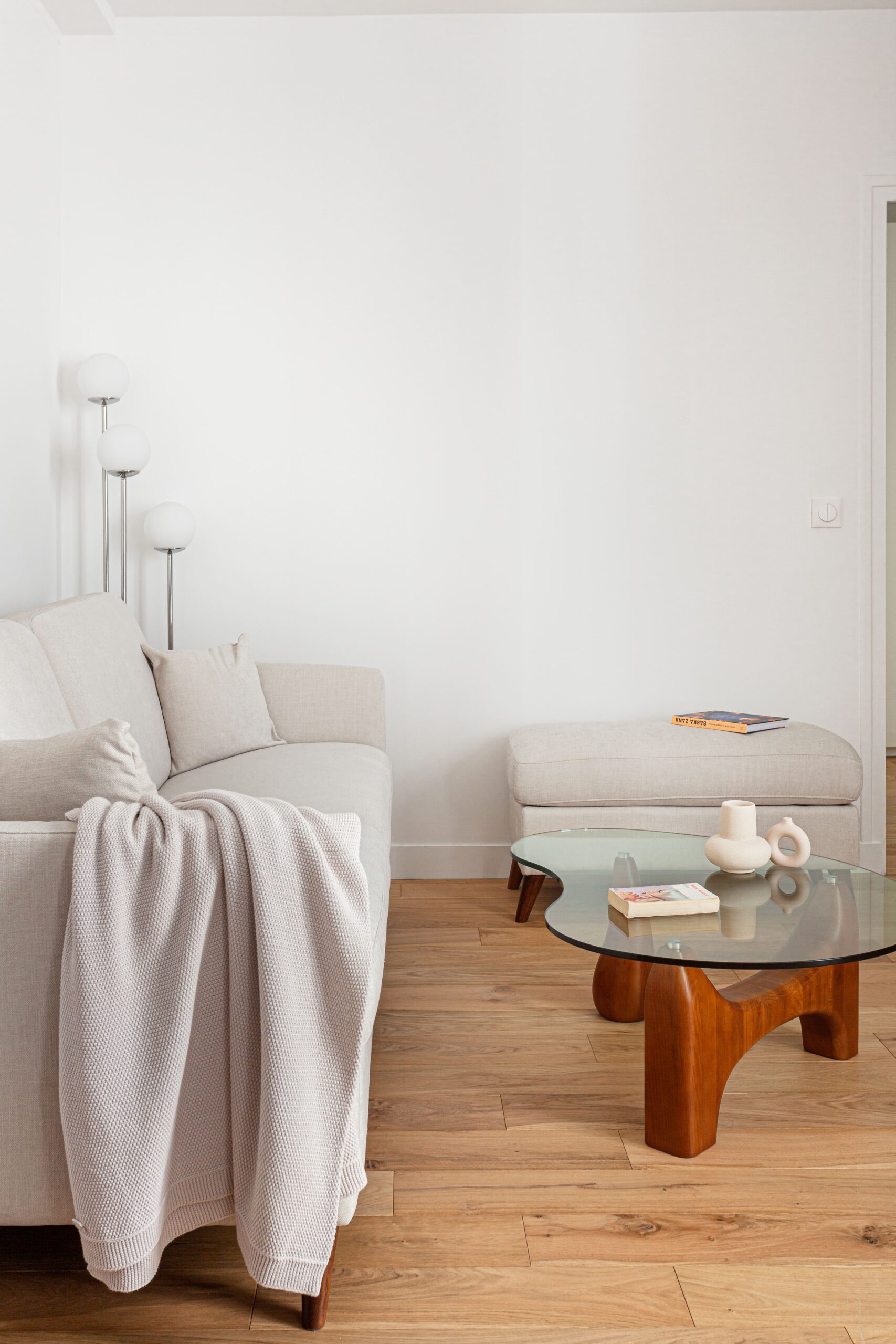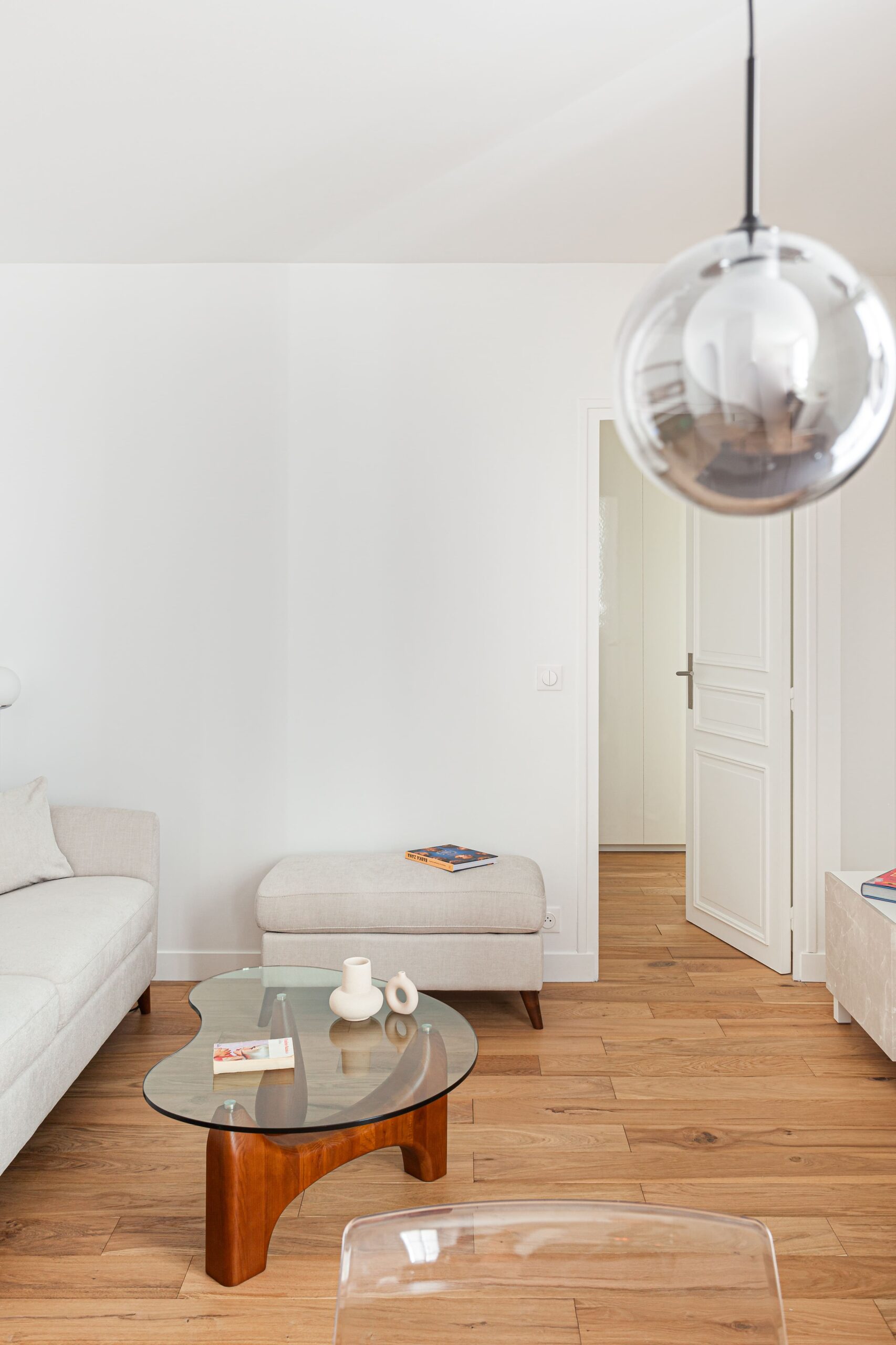 Il ne faut pas avoir peur de redistribuer les espaces : sur les bons conseils de Clementine nous avons divisé le salon en deux avec une cloison pour créer une deuxième chambre. Un parquet en pose droite a été installé pour des pièces plus chaleureuses.