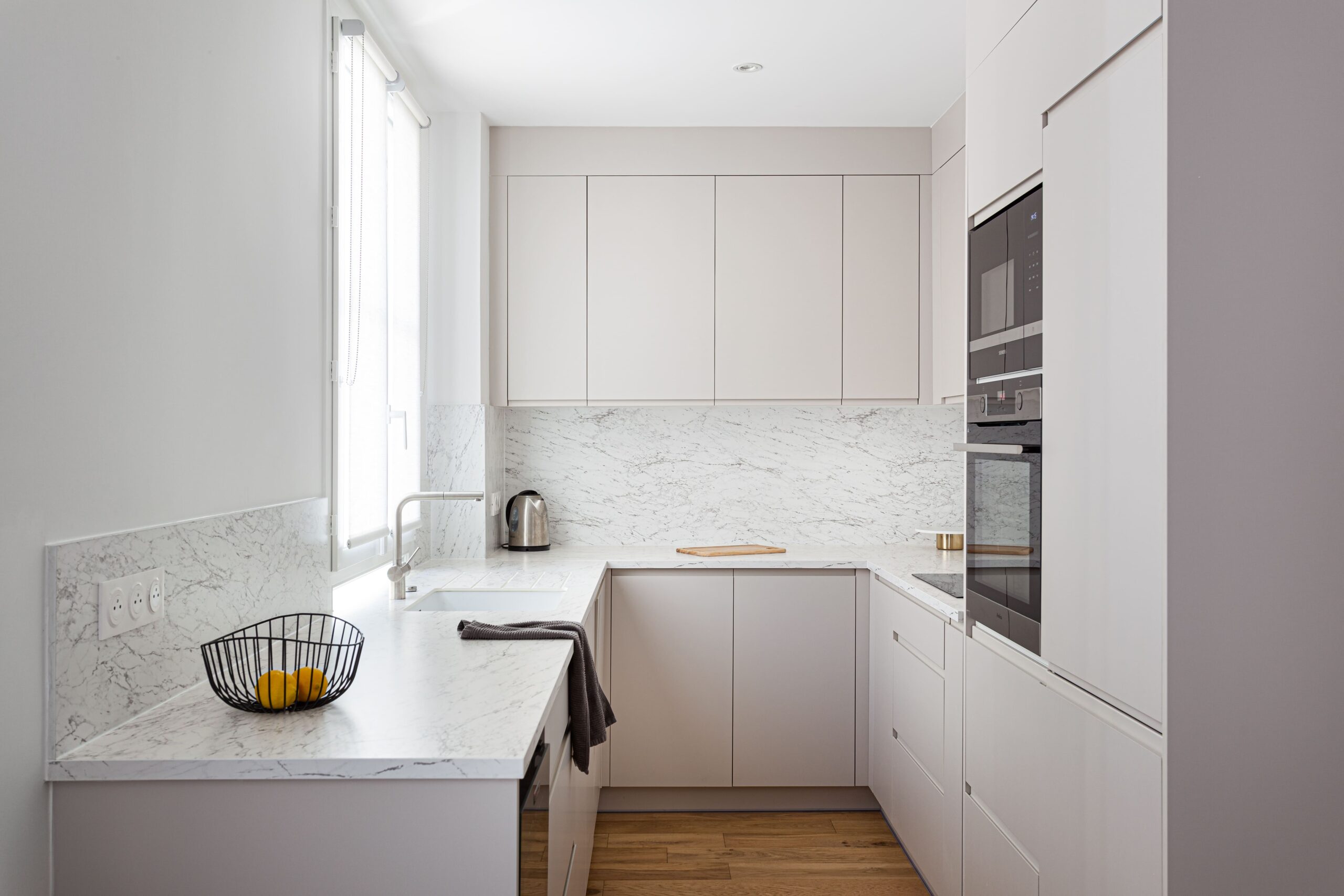 La belle cuisine, c’est une Little Worker biensûr ! Il s’agit de la gamme Opale avec ses façades couleur amande et un plan de travail compact marbré blanc.
