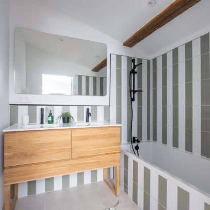 Ce projet a été très intéressant à mener. On partait de deux appartements totalement distincts, donc il a fallu penser chaque étape pour en faire un seul espace cohérent, agréable et surtout adapté à une vie de famille. La création de la tropézienne a été un vrai plus, mais aussi un vrai défi technique. Une bonne coordination, des choix de matériaux pertinents et un client très investi, c’est ce qui a fait la différence. Le résultat final est vraiment à la hauteur : un bien lumineux et clairement valorisé.