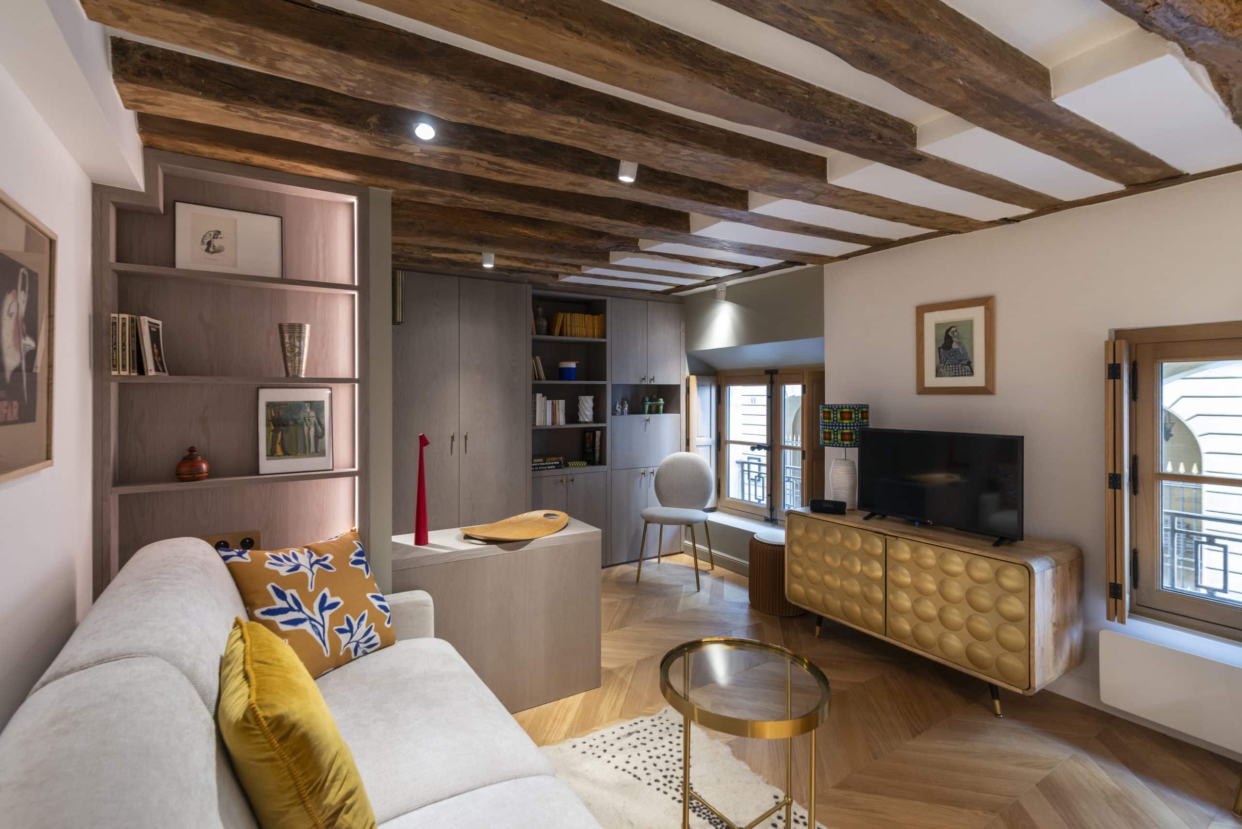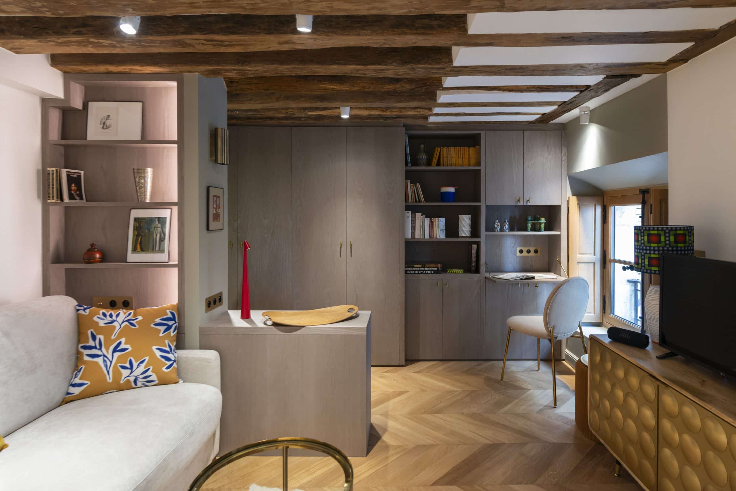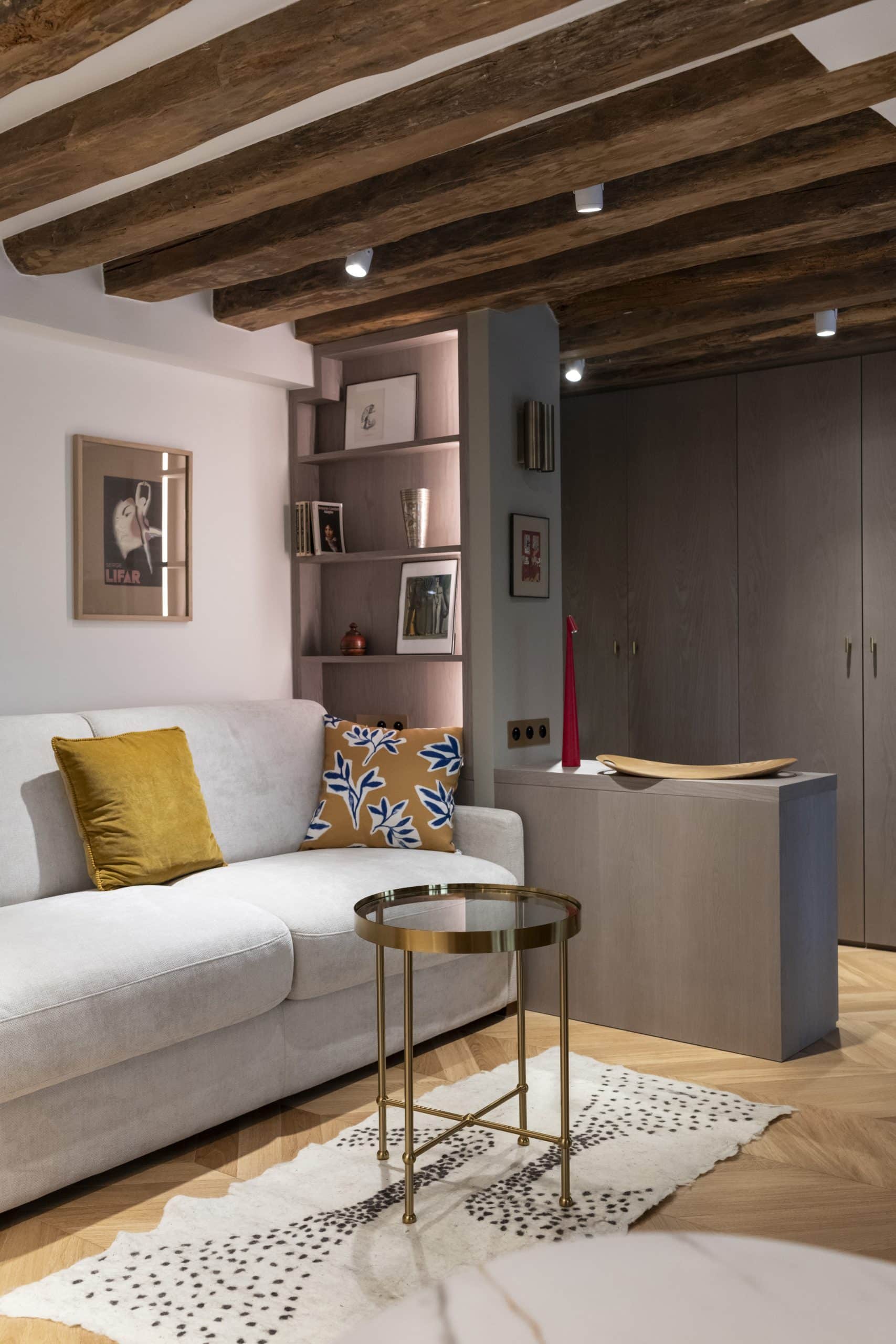 Un petit espace pour une maxi transformation, c’est ce que nous offre la rénovation de ce studio au cœur de Paris. Les clients étaient décidés à créer un bien à l’élégance parisienne destiné à  la location de courte durée. Ici tout a été repensé. Situé dans un immeuble ancien, l’appartement était un concentré d’histoire. Mais il avait perdu son âme : tour à tour local de stockage, bureau ou pièce technique, il ne ressemblait plus à un lieu de vie. Un terrain parfait pour une rénovation complète et une reconversion astucieuse en studio de charme.