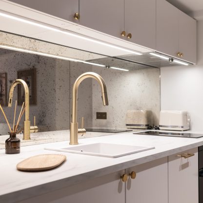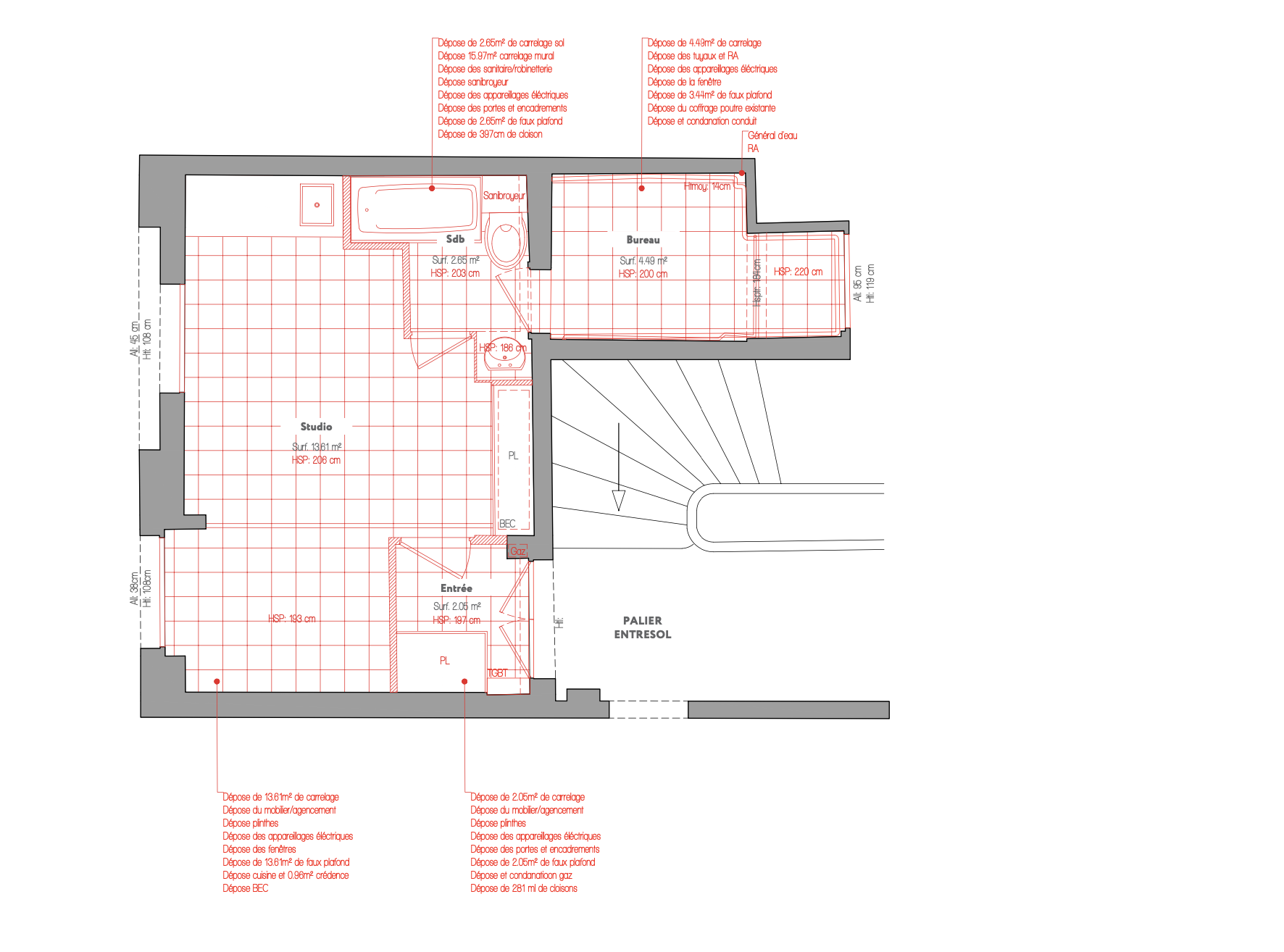 Les premières étapes ont consisté en la dépose complète des éléments existants : kitchenette, salle de bain, WC, chauffe-eau, radiateurs, cloisons, carrelage et faux plafonds. Les réseaux électriques et de plomberie ont été entièrement curés pour repartir sur des bases saines. Enfin, un ragréage fibré a été appliqué afin de garantir une surface parfaitement plane, prête à recevoir les nouvelles installations. Dans la salle de bain, une étanchéité complète a été mise en place au sol et sur les murs, suivie de la pose de carrelage et de l’installation d’une porte coulissante, d’un receveur de douche carrelé, d’un meuble vasque, d’un miroir et de faïence.