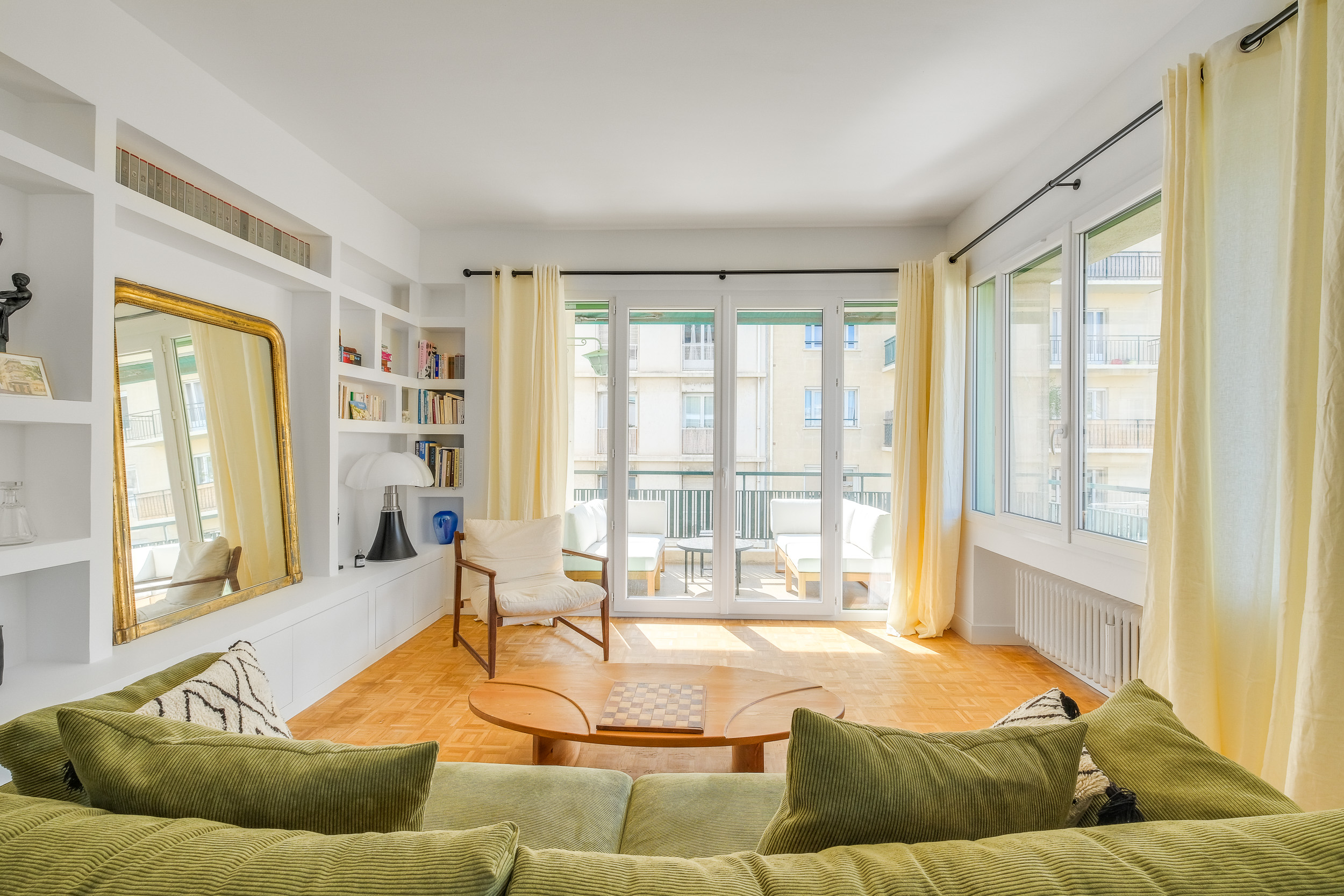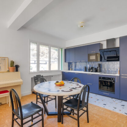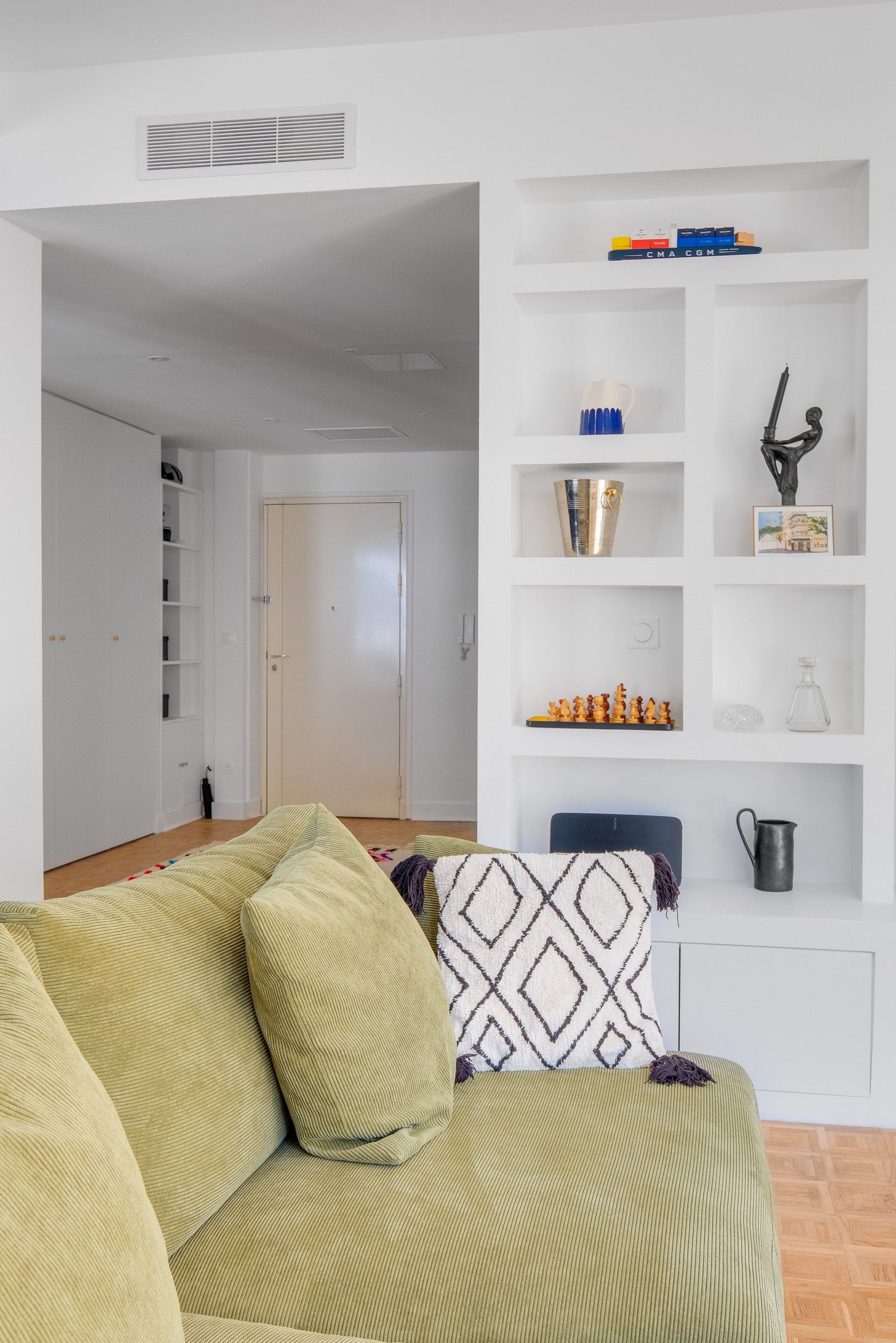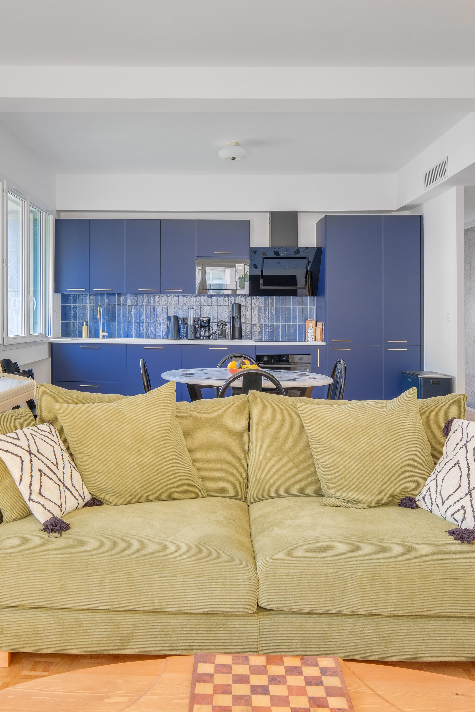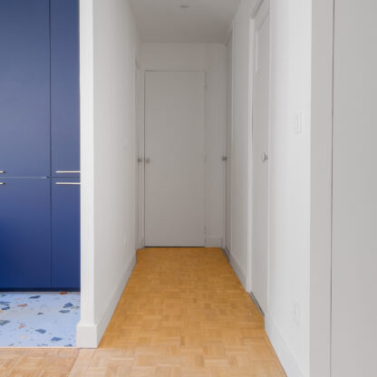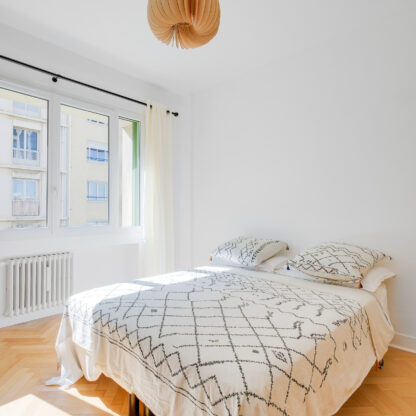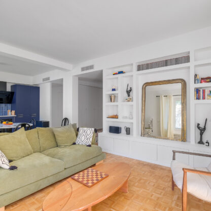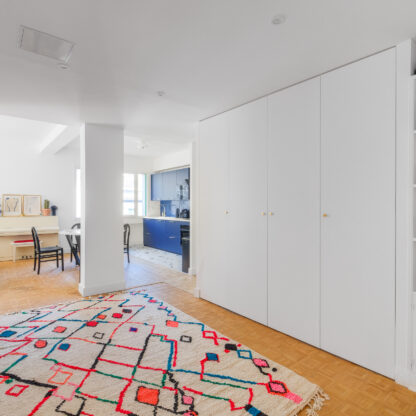 Le défi principal a été de transformer l’ancienne cuisine en une chambre, tout en agrandissant le salon pour créer un espace de vie convivial. Pour cela, nous avons opté pour un agencement sur-mesure et une palette de couleurs harmonieuse. Le résultat est un appartement lumineux et chaleureux !