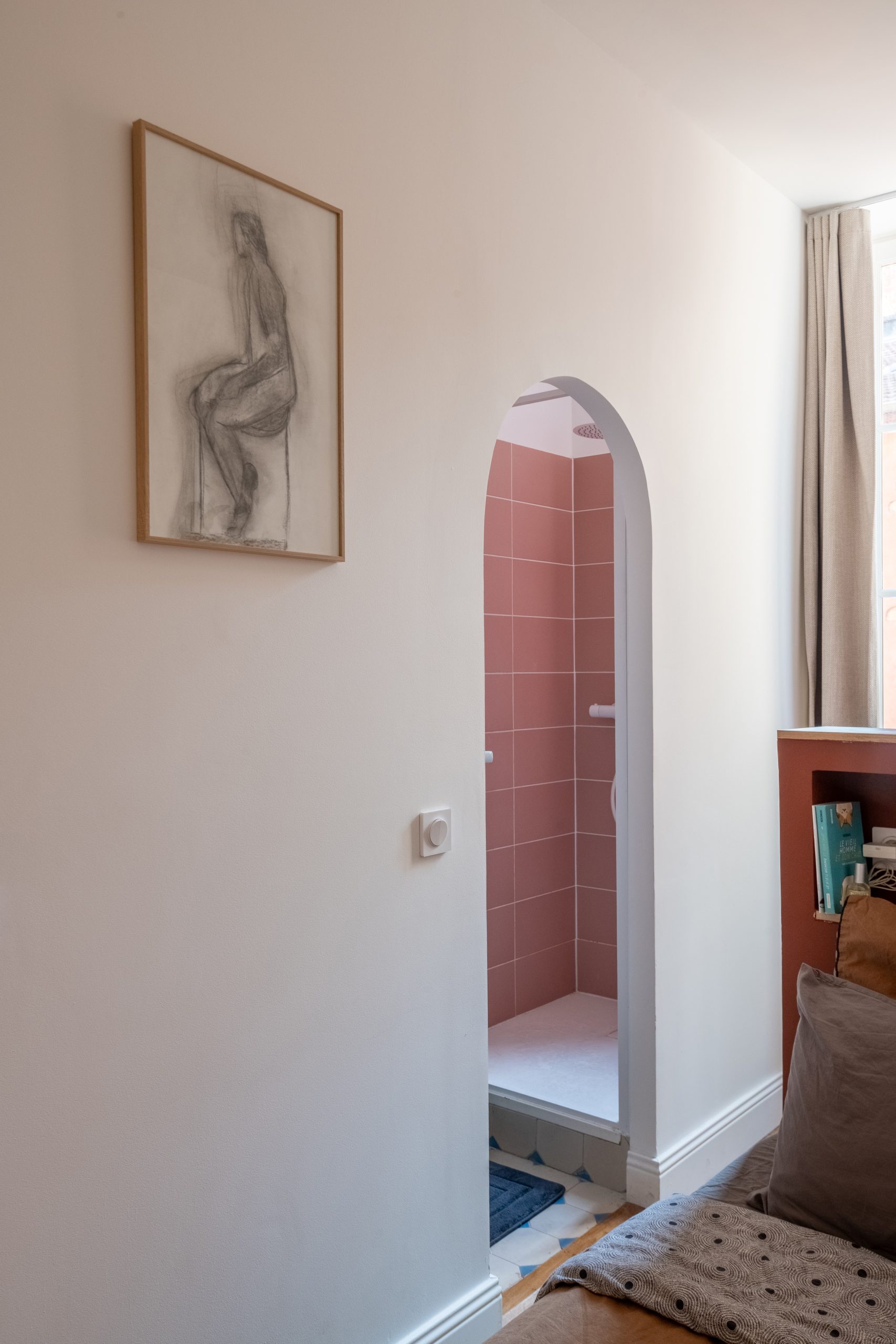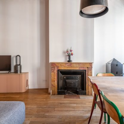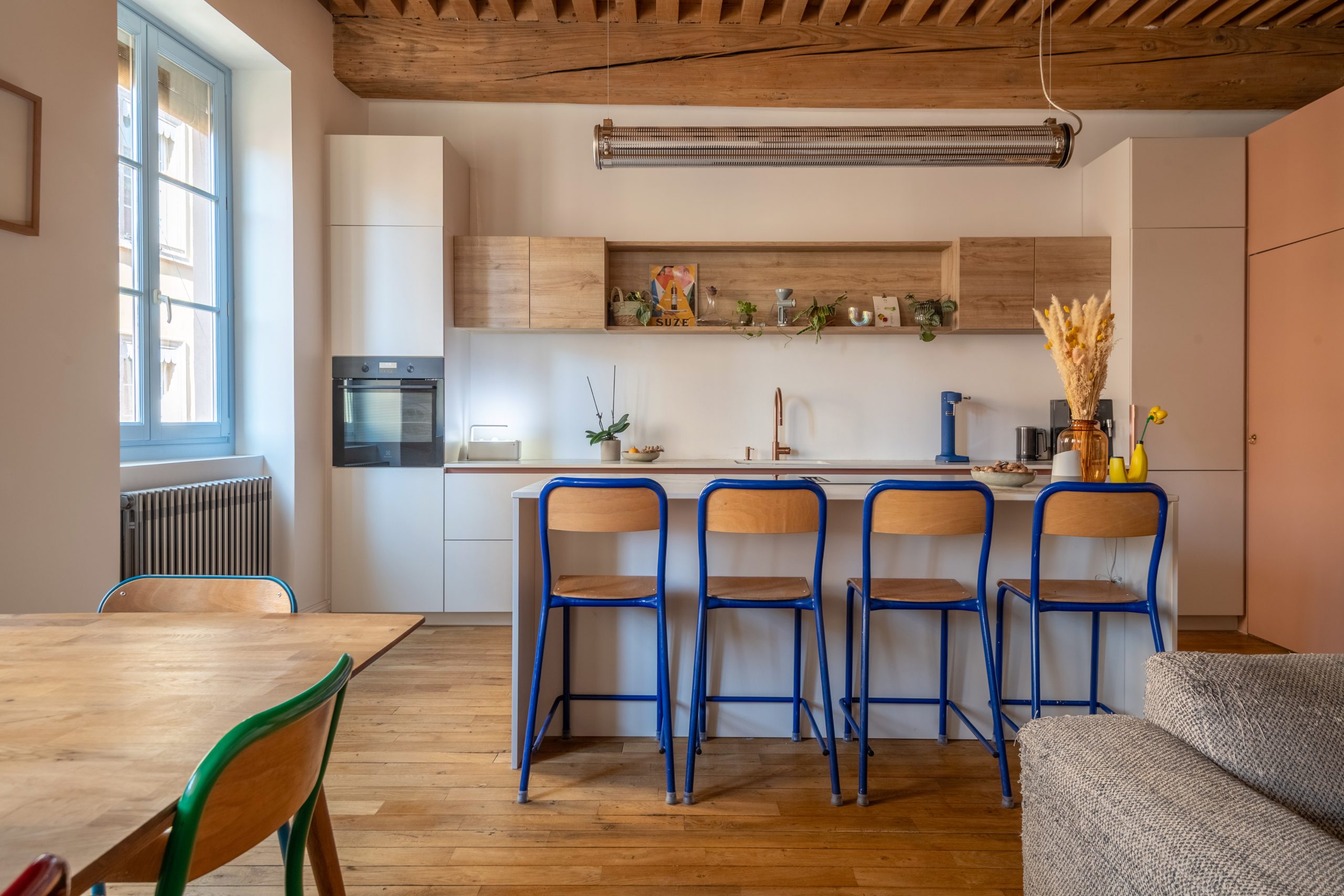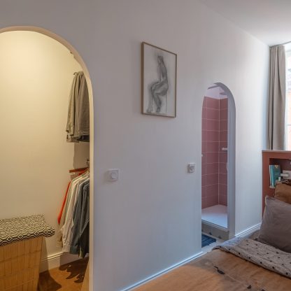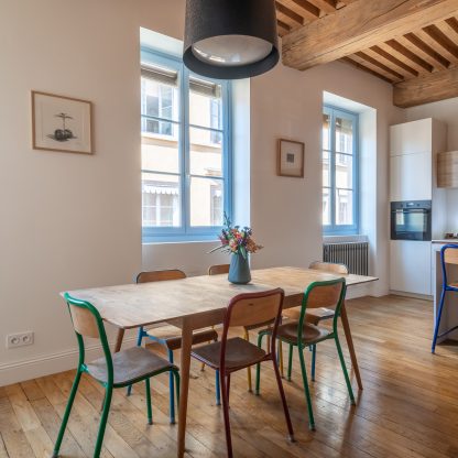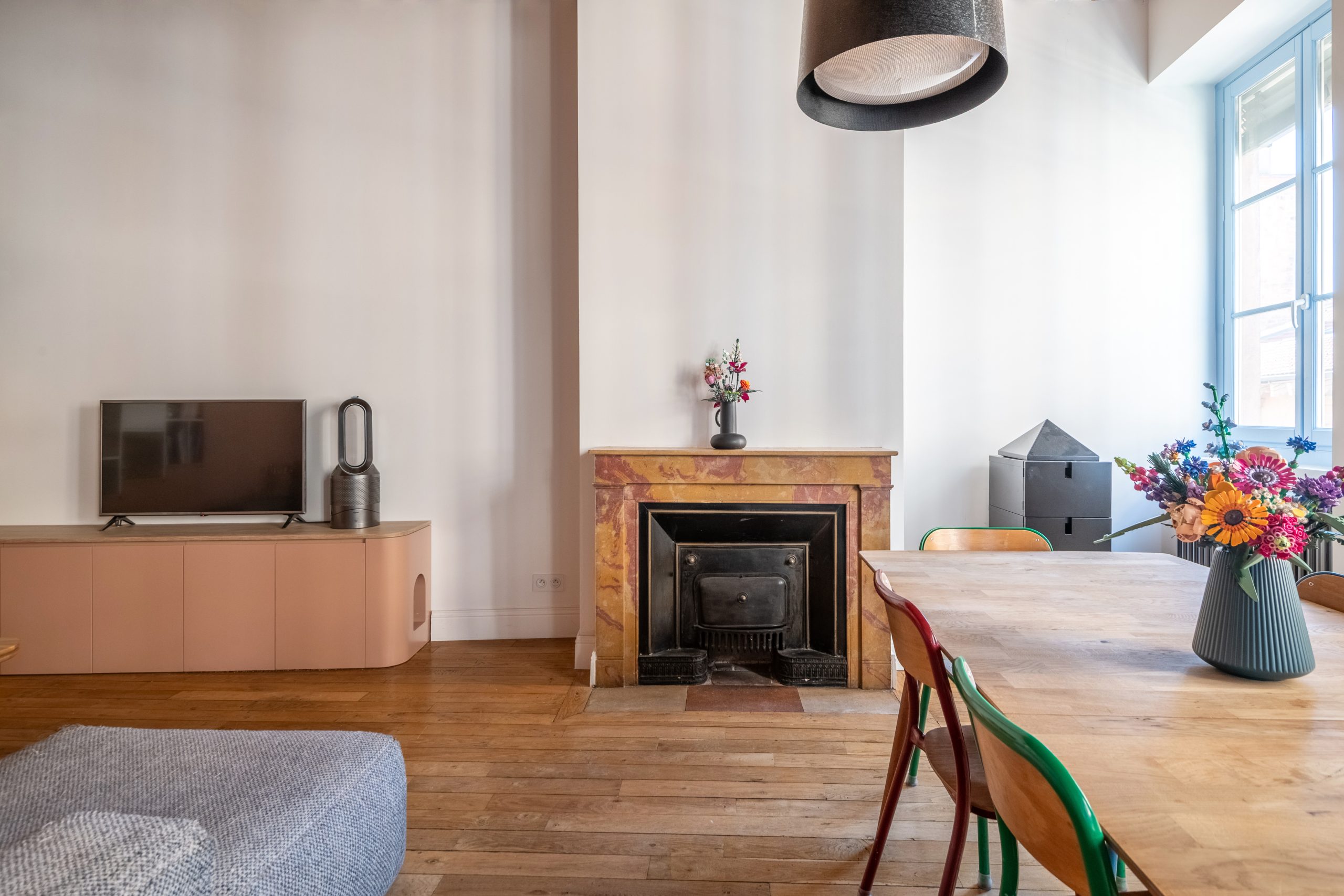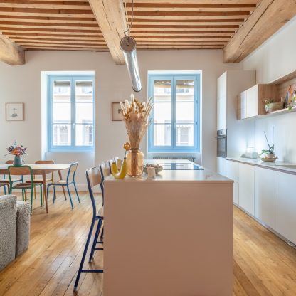 C’est ici, au cœur du 1er arrondissement de Lyon, que les heureux propriétaires ont eu un véritable coup de cœur. Malgré un appartement entièrement à rénover, ils ont tout de suite vu le potentiel : 95 m2, une belle hauteur sous plafond, et surtout un emplacement idéal dans un quartier qu’ils connaissaient bien. Un projet pour transformer cet espace brut en leur résidence principale à deux. La pièce de vie a été pensée comme le cœur du projet. L’appartement a été entièrement repensé pour créer une circulation fluide entre les espaces, avec une vraie séparation entre les pièces de jour et de nuit. L’ancienne cuisine a été déplacée et totalement transformée. Nous avons créé une suite parentale : chambre, dressing et salle d’eau ont été réunis dans un seul et même volume. Deux autres chambres complètent l’appartement, idéales pour accueillir.