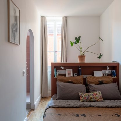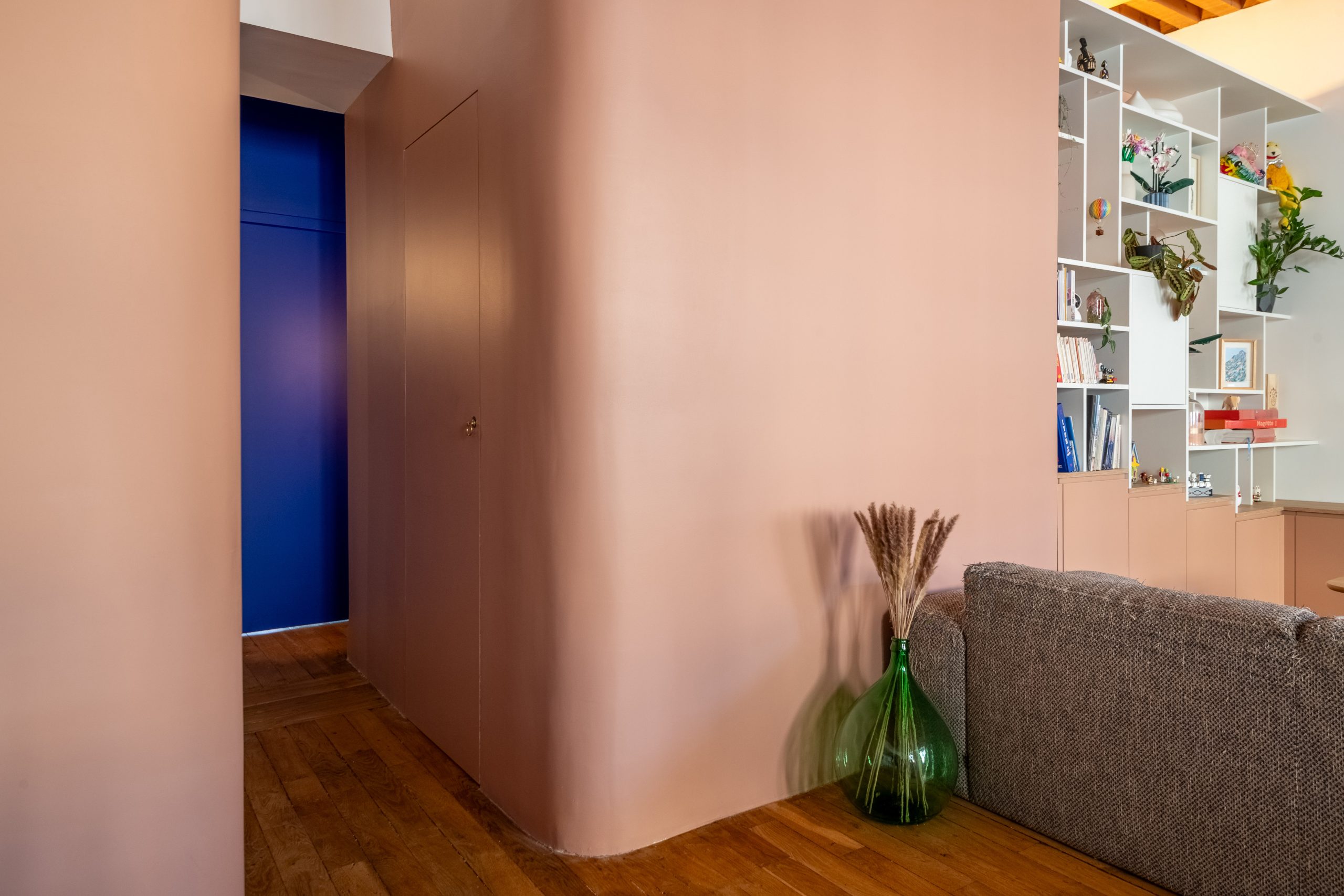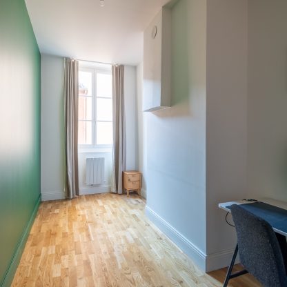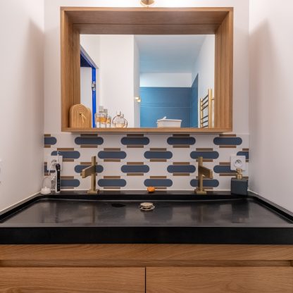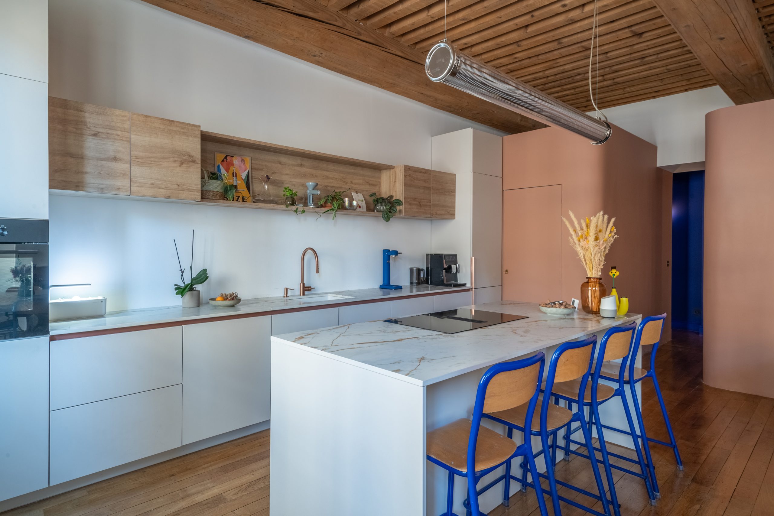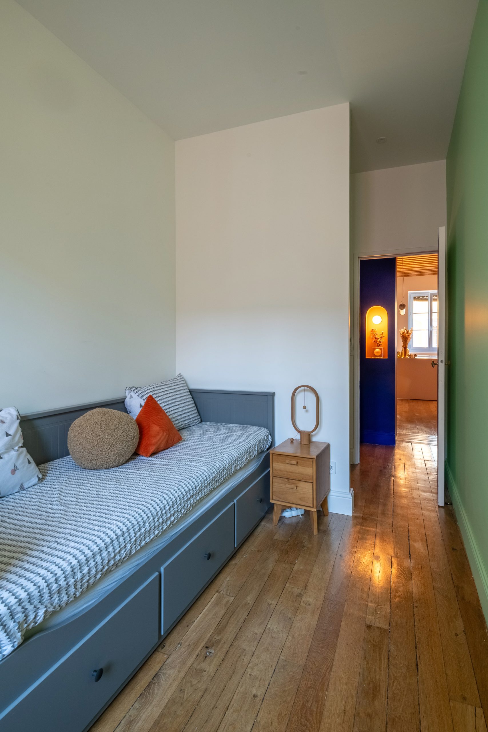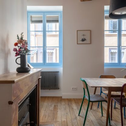 C’est ici, au cœur du 1er arrondissement de Lyon, que les heureux propriétaires ont eu un véritable coup de cœur. Malgré un appartement entièrement à rénover, ils ont tout de suite vu le potentiel : 95 m2, une belle hauteur sous plafond, et surtout un emplacement idéal dans un quartier qu’ils connaissaient bien. Un projet pour transformer cet espace brut en leur résidence principale à deux. La pièce de vie a été pensée comme le cœur du projet. L’appartement a été entièrement repensé pour créer une circulation fluide entre les espaces, avec une vraie séparation entre les pièces de jour et de nuit. L’ancienne cuisine a été déplacée et totalement transformée. Nous avons créé une suite parentale : chambre, dressing et salle d’eau ont été réunis dans un seul et même volume. Deux autres chambres complètent l’appartement, idéales pour accueillir.